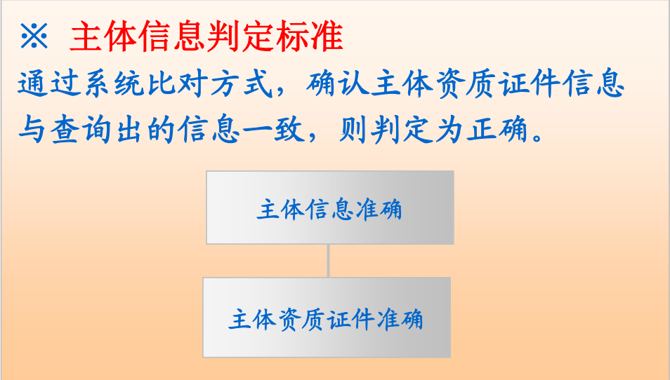 通過(guò)系統(tǒng)比對(duì),確認(rèn)主體名稱(chēng)和證件號(hào)碼與查詢(xún)出的信息一致,則判定正確。